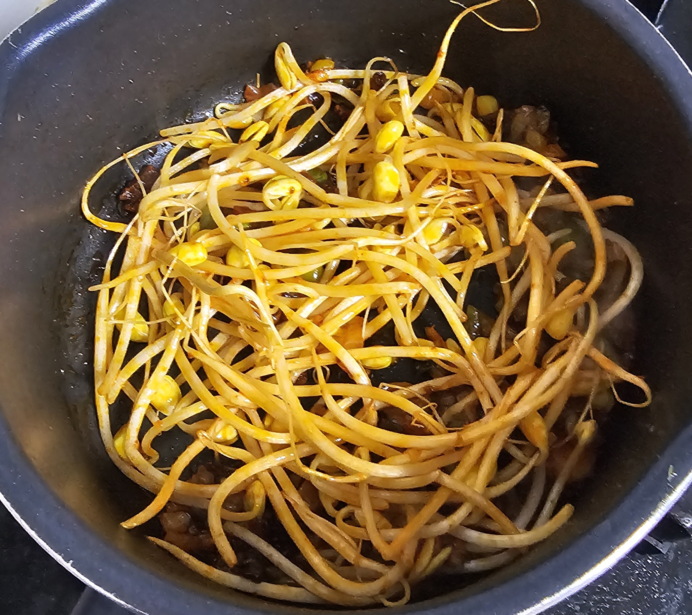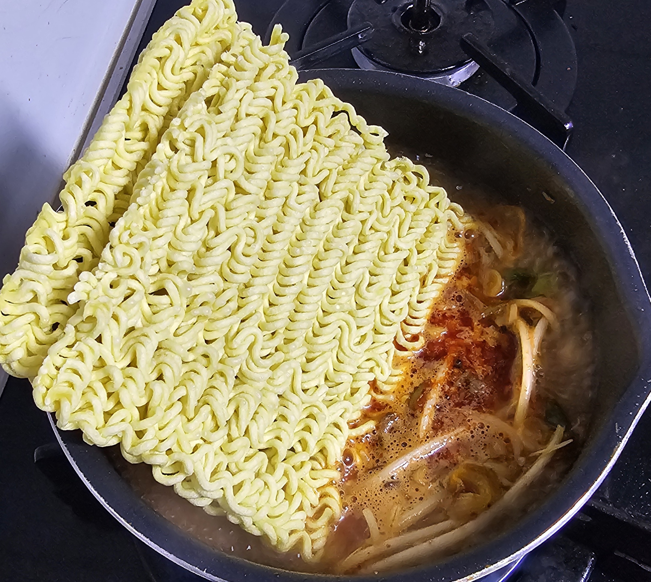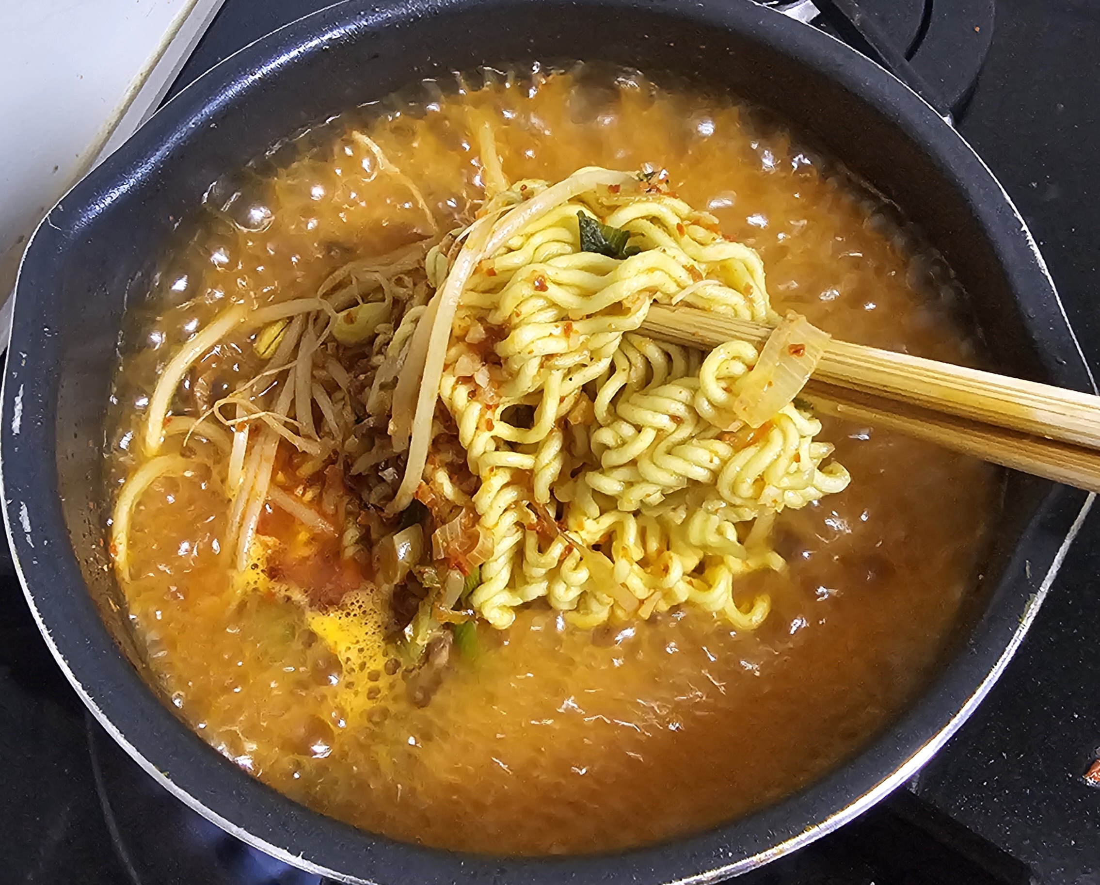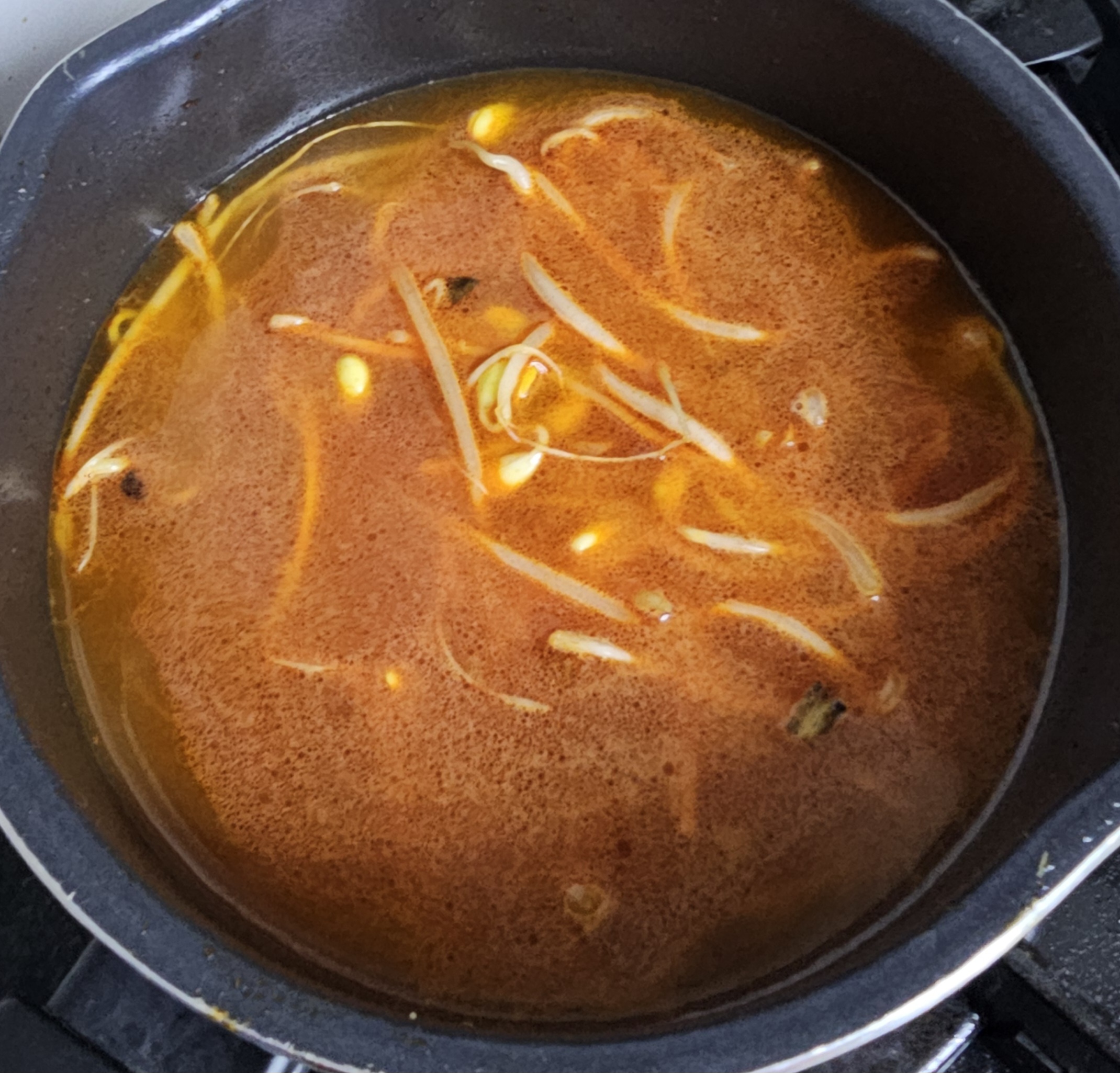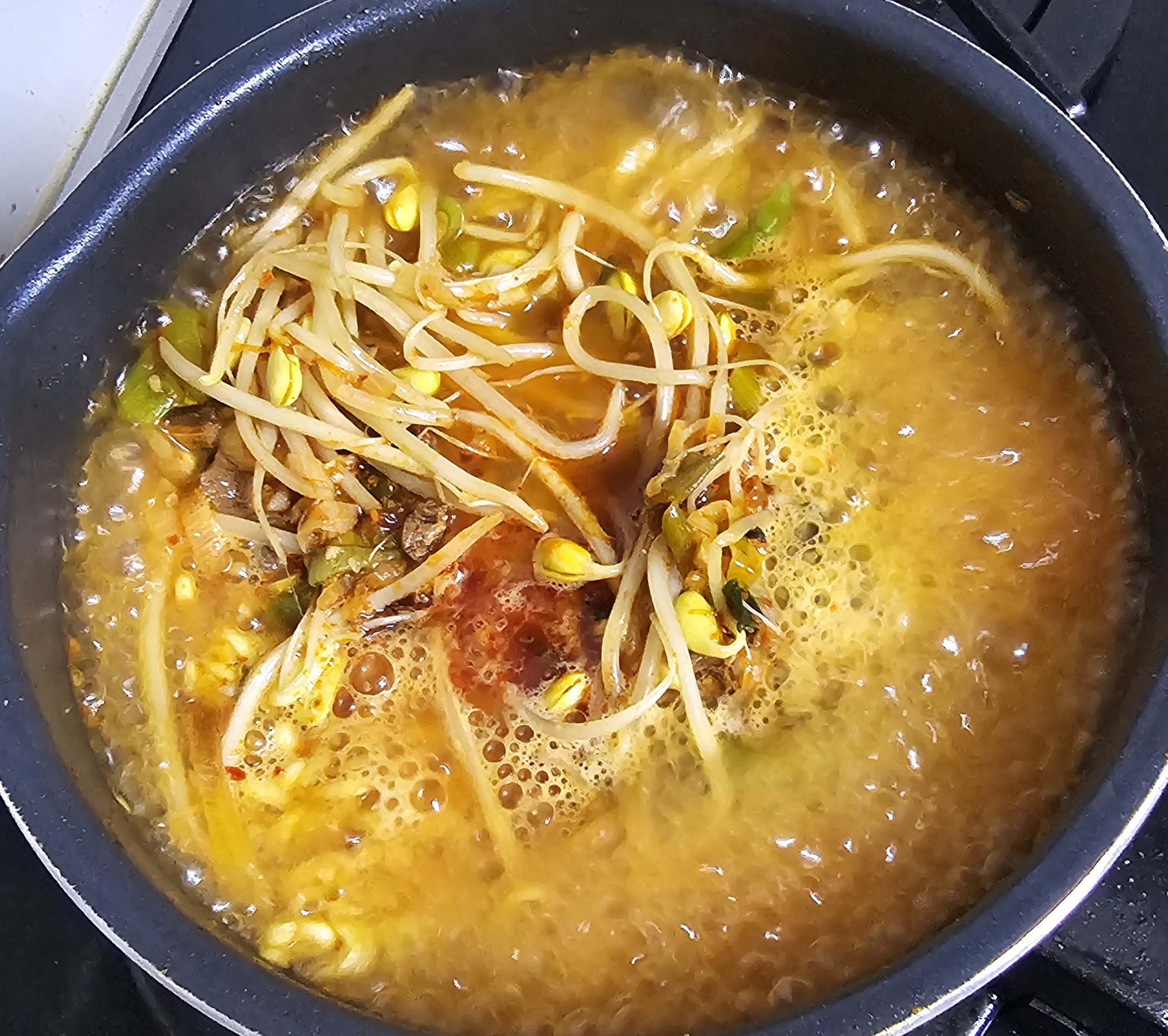 콩나물 숨 죽으면 물 넣는데 파기름을 감안해 평소보다 물을 좀 많이 넣었다. 넣고 나서야 생각났는데 물 끓기 전에 콩나물 넣으면 비린맛 올라오지 않나……? 라면스프를 믿어야겠다.